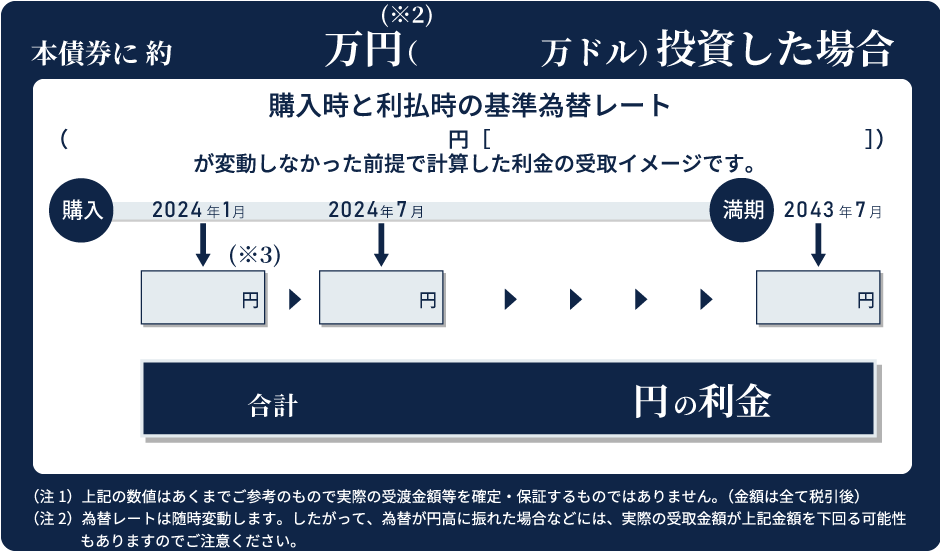 - 本シミュレーションにおいては、利金は税金控除後の金額で表示しております。なお、適用される税制及び税率等については、今後変更される場合があります。
