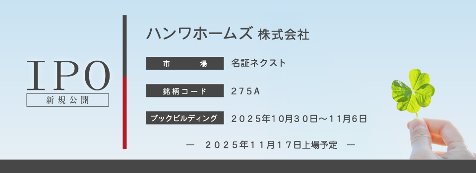 - 新規公開株式のお取引にあたっては、株式相場等の変動に伴い、上場後の新規公開株式の価格が変動することによって損失が生ずるおそれがあります。