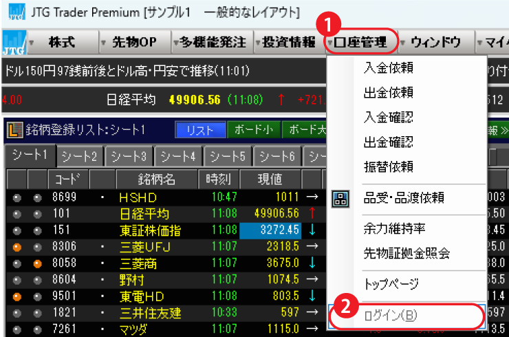 1.上段メニュー @[口座管理]−A[トップページ]の順にクリックしてください。