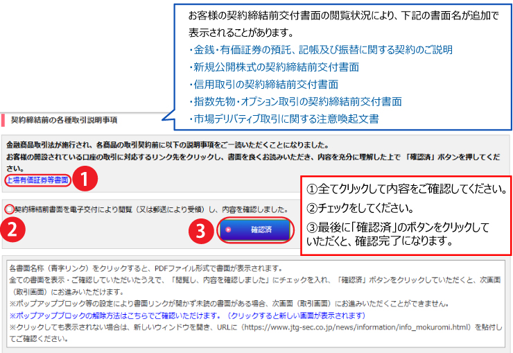 各書面名をクリックするとPDFファイル形式で書面が表示されます。各書面を表示・ご確認していただいた上で、チェックをして「確認済」ボタンをクリックすると、取引画面にお進みいただけます。