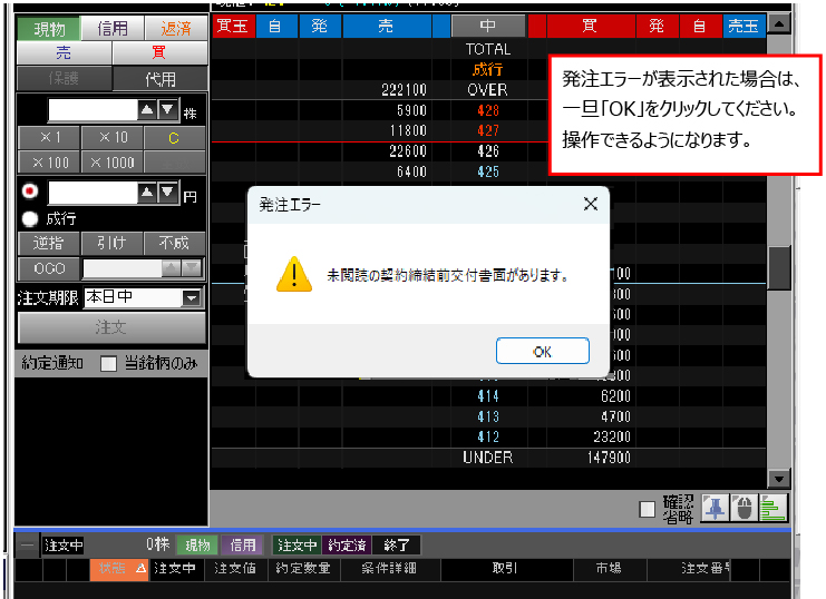 書面未確認の場合、注文時に「発注エラー:未閲読の契約締結前交付書面があります」のメッセージ画面が表示されます。