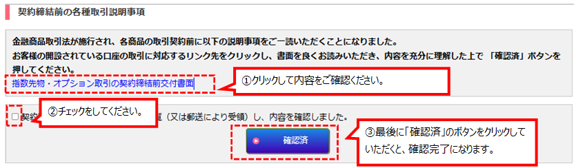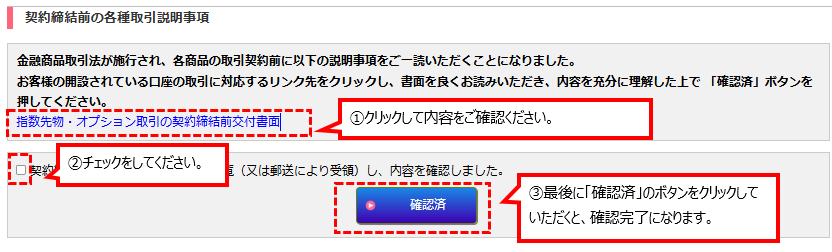 電子交付対象のお客様は、上記の日程以降、お取引画面へ最初にログインするとき、「契約締結前の各種取引説明事項」画面(指数先物・オプション取引の契約締結前交付書面)が表示されますので、各書面の内容を十分にご確認の上、以下方法によるお手続きを行っていただきますようお願い申し上げます。