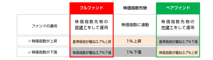 株価指数先物取引を積極的に活用し、株価指数の値動きの概ね3.7倍程度あるいは概ね3.7倍程度逆となる投資成果を目指します。
