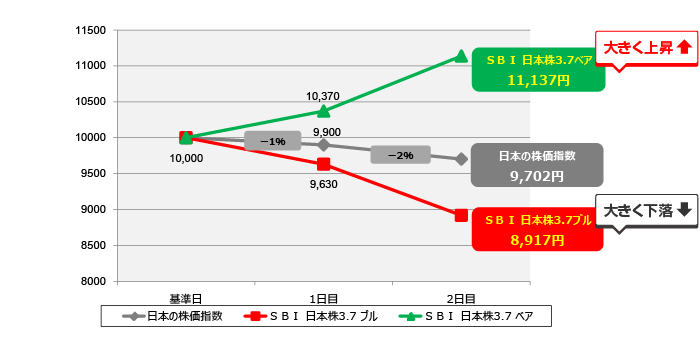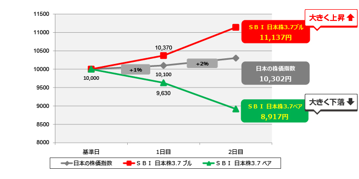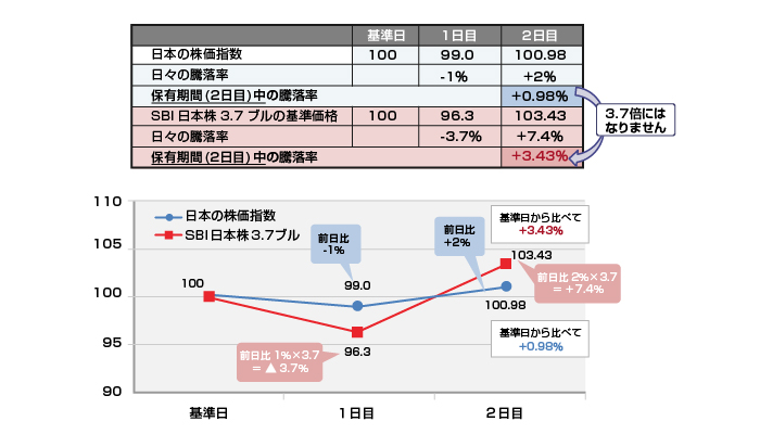 例えば、1日目に、日本の株価指数が前日比1%上昇すると、3.7ブルは前日比3.7%上昇します。