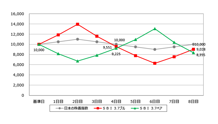日本の株価指数が上昇・下落をしながら動いた場合は、保有期間が長くなるほど基準価額が大きく押し下げられる傾向にあります。 例えば、基準日を10,000円として、その後、株式市場が上昇・下落を繰り返し、8日目に元の10,000円に戻ったとします。 しかし、赤、緑のチャートで示している3.7ブル、3.7ベアそれぞれの基準価額は押し下げられ、8日目に10,000円を下回っています。